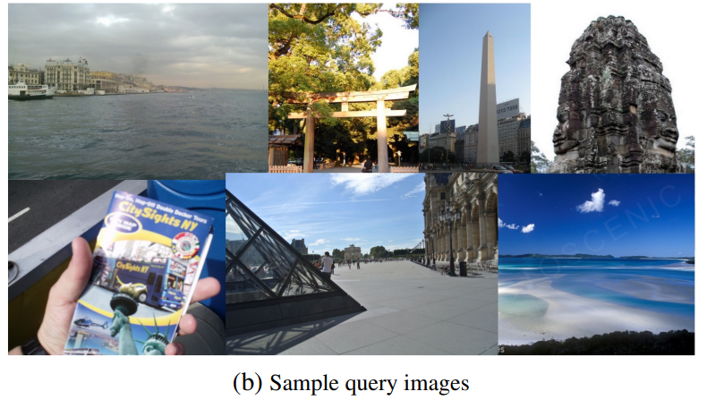또한, 기존의 랜드마크 중심 데이터셋들이 global descriptor가 잘 작동하도록 되어있는 반면에, 새로 만든 데이터셋은 다양한 장면들이 포함되어 있어 사실적입니다. 예시가 좀 많은데 대표적으로 위의 그림을 보시면, 실제 랜드마크도 아니고 안내책자에 그려진 랜드마크가 쿼리로 주어진 것을 볼 수 있습니다.