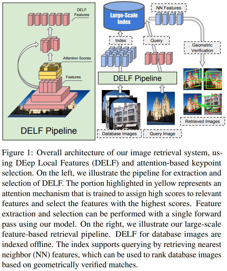 • Attention을 포함한, CNN 기반의 local feature 제안(DELF)했고, 이를 통해 local descriptor와 keypoint를 한번에 뽑을 수 있게 되었다고 합니다.