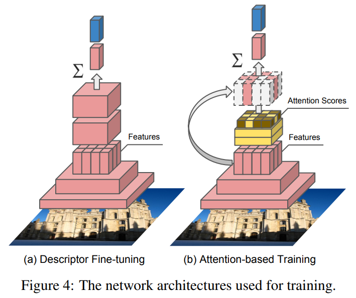 기존의 SIFT와 같은 keypoint selection 방법론들과의 가장 큰 차이는, descriptor의 생성 순서입니다. 기존의 방법론은 keypoint selection 이후에 descriptor를 추출하지만, DELF는 반대입니다. 또한 이미지 검색과 같은 task에서는 object instance를 구별할 수 있는 keypoint를 선택하는 것이 중요합니다. DELF는 이것을 feature extract를 학습하는 과정(그림4-a)과 Attention을 학습하는 과정(그림4-b)를 통해 달성합니다.