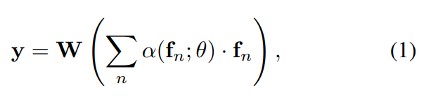 (1)번 수식에서 $f_n$은 d차원의 feature를 의미합니다. α(f_n; θ)은 score function을 뜻합니다. (W ∈ R^M×d) 그래서 위의 수식은 feature vector의 weighted sum이 되고, M 클래스를 예측하는 CNN의 FC 레이어의 weight를 나타내게 됩니다.