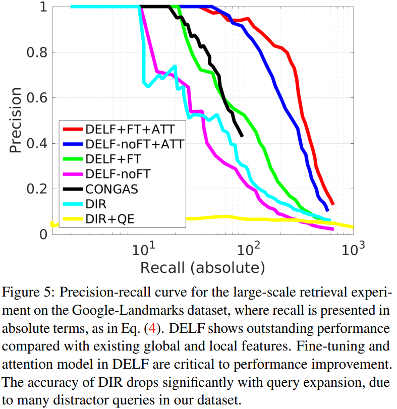 이 새로운 metric을 적용한 PR-curve는 위와 같이 그려집니다. 이 실험을 통해 DELF의 성능에 finetuning과 attention 둘 다 영향을 미치지만, 영향을 크게 미치는 부분은 attention이라는 것을 알 수 있습니다. 추가적으로 위 실험에서 비교한 DELF/CONGAS/DIR 모두 메모리 요구량은 동일한 상태라고 합니다. (동일한 메모리를 먹지만 성능은 저만큼 차이가 난다는 뜻입니다.)