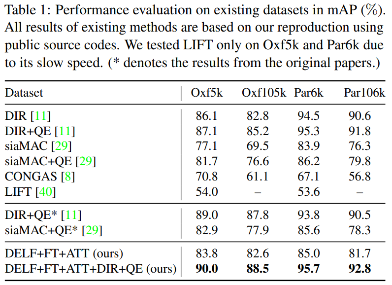 기존 데이터셋에서는 mAP를 이용해서 비교 실험을 수행합니다. 다만, DELF+FT+ATT의 성능이 다른 방법론들에 비해 그렇게 좋지 않습니다. 하지만 DIR과 결합했을 경우에는 성능이 매우 좋았습니다. 논문 저자들은 이 부분이 DELF global feature descriptor는 가지고 있지 않은 정보들을 encoding 할수 있음을 보여준다고 말합니다. DELF 단독으로는 왜 성능이 떨어지는지에 대한 내용이 없어서 좀 아쉽네요.