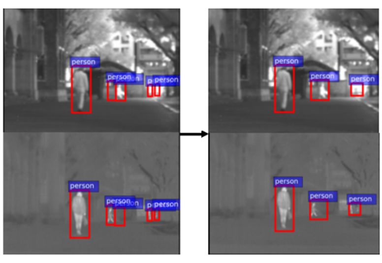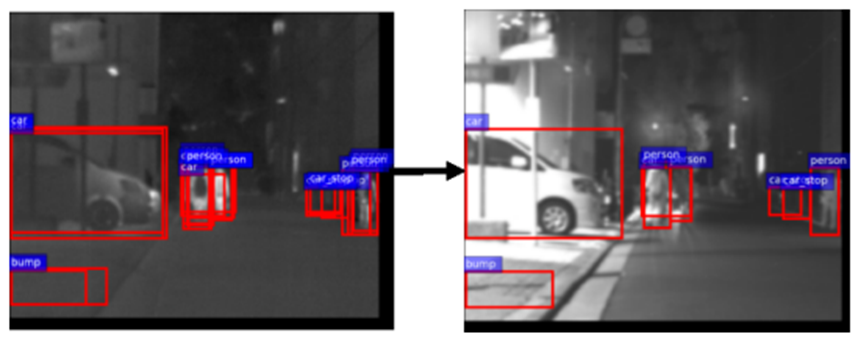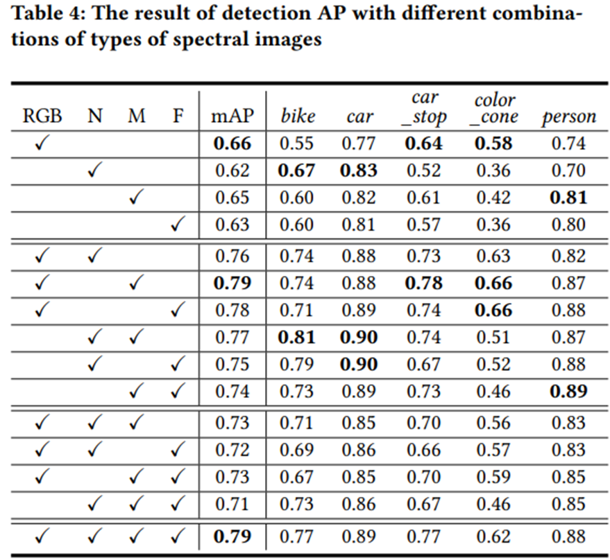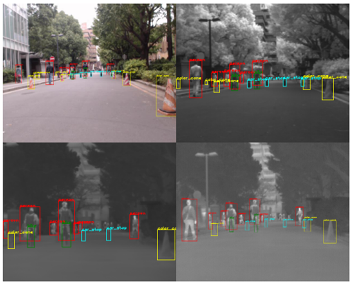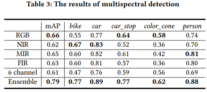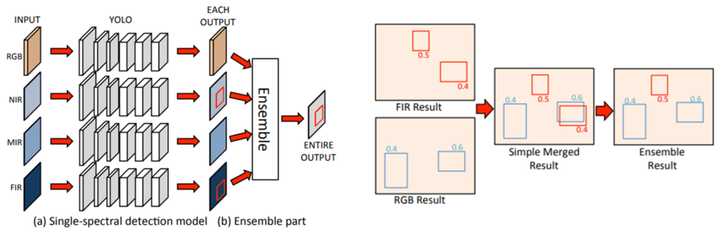 In this paper, authors used YOLOv1, as the object detection model. RGB, FIR, MIR, and NIR channels were trained separately using the original. This is because it is thought that the proposed method can fully uses the features of each spectral image by learning on objects visible on each spectrum. Then, The output results from the four single-spectral detection models are combined.