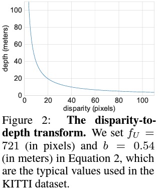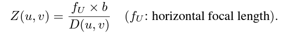 이때 Stereo Depth network가 Depth를 예측할 수 있도록 기존에 stereo image의 feature를 matching 하기 위해 두 feature를 concat 한 cost volume disparity를 아래 식을 이용해서 cost volume depth로 변경합니다.