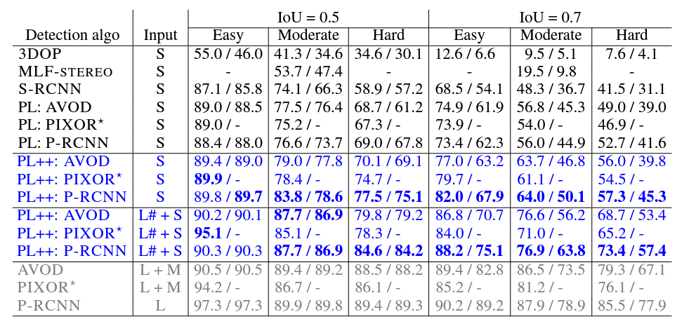 먼저 Car 의 성능이 위에 표에 나타나 있습니다. Input 이 S일 때를 먼저 보면 단순히 Pseudo-LiDAR일때와 비교해서 전체적으로 높은 성능 향상을 보이며 HARD 에서 성능향상이 두드러지게 나타난것을 볼 수 있습니다. 이것으로 통해 먼 물체 대해서 더욱 높은 성능 향상을 이뤘다는것을 알 수 있습니다.