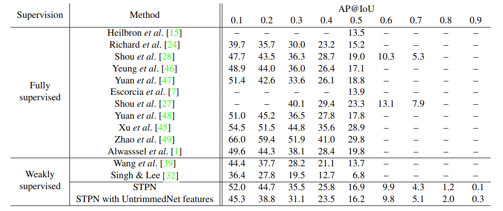 다음으로는 ActivityNet에 대한 benchmark입니다. 이전에는 ActivityNet으로 Weakly Supervised Temporal Localization을 평가하는 경우가 없어서 이번 논문이 처음이라고 합니다. STPN의 저 성능은 계속해서 후속 연구들의 benchmark로써 작용하고 있으니 많은 연구자들이 자신들의 방법론이 어느정도 인지 판가름하는 데 도움을 줬을 것 같습니다. 확실히 ActivityNet에서는 당시 Supervised method에 비해서는 떨어지는 성능을 보여주네요.