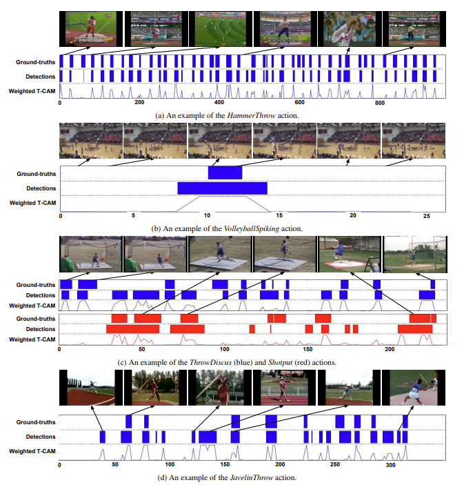 가장 위에 (a)를 보면 HammerThrow action에 대한 영상입니다. GT를 보면 상당히 많은 action 구간이 존재하고 있습니다. 본 방법론이 정확하게 까지는 예측하지 못하지만 pinpoint 정도는 잡고 있다는 것이 꽤나 흥미롭습니다.