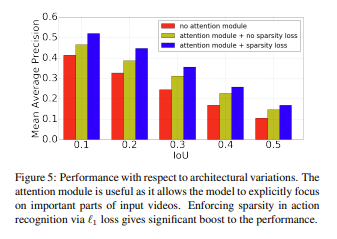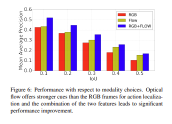 다음으로는 Modality에 대한 실험 입니다. RGB와 Optical Flow를 둘 다 무조건 사용해야 하는 이유를 보여주는 그래프 입니다. 실제로 action recognition 분야에서도 optical flow를 같이 사용했을 때 성능이 boosting 되는 것처럼 마찬가지로 localization에서도 먹힌다는 것을 보여주고 있습니다.