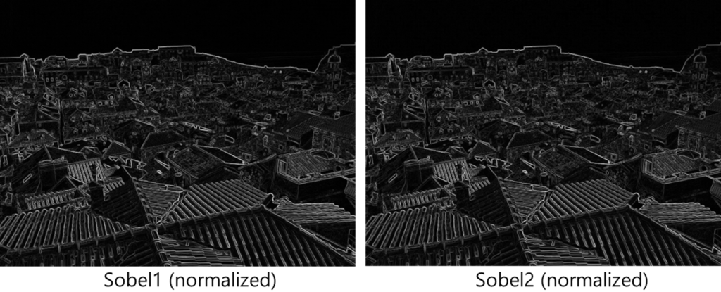 자 위에 두 개의 이미지가 있습니다. 두 이미지는 동일한 이미지이며, 밝기 차이를 나타내고 있습니다. 동일한 이미지에 대해서 가장 일반적인 그레디언트 기반 엣지 및 코너 추출 알고리즘인 Sobel 알고리즘을 통해서 엣지를 추출하면 다음과 같습니다.