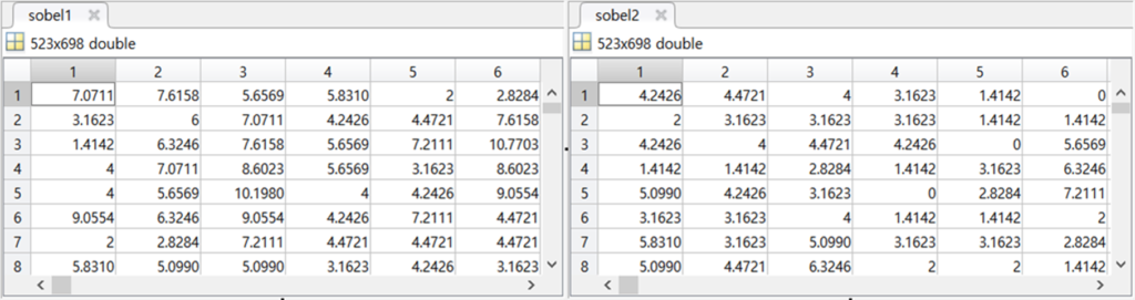 앞서 Sobel의 결과와 비슷하게 두 영상에서 엣지나 코너가 잘 추출된것처럼 보입니다. 그렇다면 실제 값들의 분포는 어떻게 될까요?