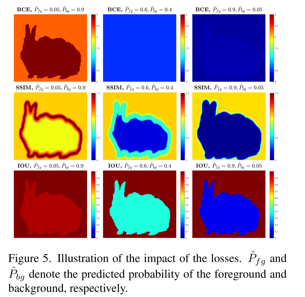 해당 논문의 핵심적인 전략은 loss에 있습니다. 저자는 보다 좋은 성능을 가지기 위해서는 픽셀 수준의 예측 뿐만이 아니라 윤곽 정보에 대해서도 최적화를 수행한다고 주장합니다. 기존의 방법론들은 대부분 BCE Loss만을 사용하여 최적화를 수행합니다. CE Loss의 특성상 픽셀의 맞고 틀림만을 예측합니다. 그럼으로써 Fig 5의 1열과 같이 학습이 진행됨(왼쪽에서 오른쪽 그림 순)에 따라 전반적인 부분에서는 최적화가 진행되는 것을 볼 수 있습니다. 영상의 대부분을 차지하는 백그라운드도 최적화 비율 큰 부분을 차지하게 되면서 class imbalence 문제를 야기 시키며, 백그라운드에서는 0에 까가운 에러값을 보이고 있습니다. 이러한 문제로 적은 부분을 차지하는 전경에는 집중하지 못하는 문제가 발생합니다. 그렇기에 저자는 픽셀 수준에서 예측하는 것이 아닌 pixel, patch, map-level에서 예측할 것을 제안합니다.