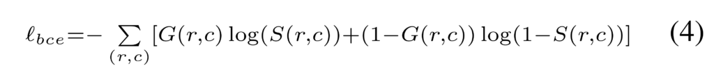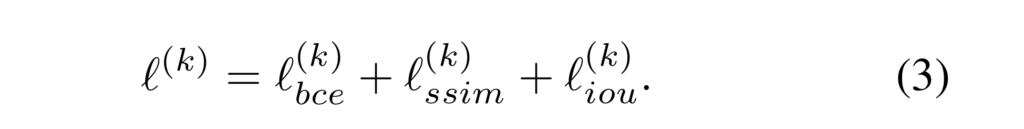 Loss는 픽셀 수준의 예측을 위한 BCE loss, 구조적인 부분에서 예측 성능을 향상 시기키 위한 SSIM loss와 instance 측면에서의 성능 향상을 위한 IoU Loss의 합으로 구성됩니다. 먼저 BCE Loss는 잘알다시피 픽셀 수준에서의 이진 분류 성능 향상을 통해 배경과 전경, 전반적인 예측을 위해 다음과 같은 정의됩니다.