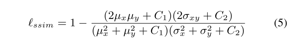 G(r, c)는 r, c 픽셀에서의 GT에 해당하며, S(r,c)는 r,c 픽셀에서의 모델의 예측 값으로 구성됩니다. 앞서 언급한 바와 같이 해당 loss의 직관적인 역할은 fig 3에서도 확인 할 수 있습니다. 하지만 앞서 언급한 바와 같이 상대적으로 많은 비율을 가진 배경에서 오버피팅이 발생시킨다는 문제가 발생합니다. 그렇기에 저자는 영상 평가 메트릭으로도 많이 사용하는 SSIM을 이용한 SSIM loss를 사용합니다. 이는 다음과 같이 정의됩니다.