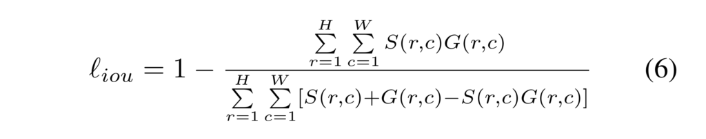 여기서 u, \omega 는 각각 패치 x(예측값), y(GT)간 영상 패치의 평균과 표준 분산을 의미합니다. C는 0 값을 방지하기 위한 파라미터 입니다. Fig 3의 2열을 보면 초기엔 경계면이 크고 오차값이 크게 발생하다가 학습이 진행됨에 따라 경계면이 점점 얇아지고 오차율이 떨어지는 현상을 볼 수 있습니다. 이를 통해 해당 loss를 통해 모델이 전경과 배경의 구분을 명확하게 학습함으로써 모호한 예측을 덜 할 수있도록 합니다. 추가로 저자는 BCE loss로 인한 불균형을 조금 더 보완하기 위해 물체 검출 혹은 영상 분할에서 흔하게 사용되는 평가, IoU를 이용한 loss를 사용합니다. Fig 3의 3열을 보면 배경에서는 오차 값이 그대로인 상태를 유지하다가 학습에 따라 물체에 해당하는 부위에서만 에러율이 줄어드는 것을 볼 수 있습니다. 해당 loss는 다음과 같이 정의됩니다.