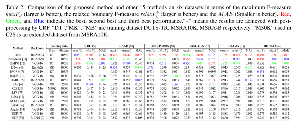 저자는 6가지 SOD 데이터 셋과 16 SOTA 모델과 비교를 수행하였으며, 우월한 성능을 보여줍니다. MaxF_b는나 여러 F-score에서도 오차율이 얼마나 적은 성능을 보이는지 relaxF는 경계면을 얼마나 잘 예측하는지 비교하기 위한 성능 지표이며, MAE는 픽셀 수준에서의 오차율 입니다.
