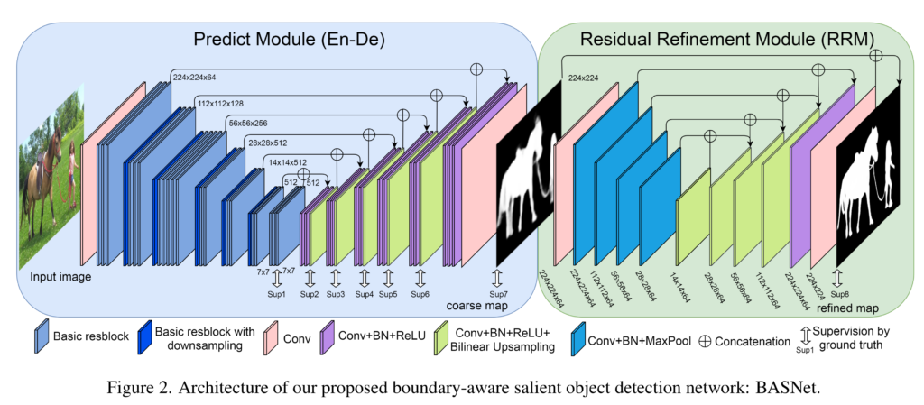 BASNet은 Predict module, Residual Refinement Module 두 가지 모듈로 구성되어 있습니다. 앞단의 predict module에서 saliency map을 획득한 뒤, 뒷 단의 refine module에서 해당 map의 boundary quality를 높여 최종적인 예측값을 출력하는 구조를 가지고 있습니다.