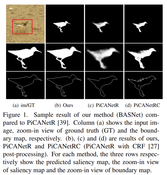 정성적인 결과에서도 다른 방법에 비해 우월한 성능을 보여줍니다. 주목할 부분은다른 방법론에서 흐리거나 경계면이 명확하지 못한 예측을 하는 반면에 BASNet에서 개선된 성능을 보여줍니다.