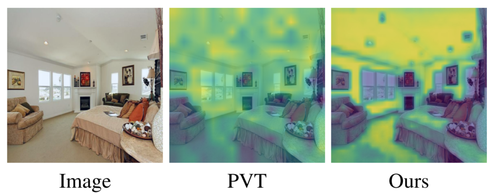 하지만 이번 CVPR2022 논문의 저자는 PVT가 SR module을 통해 연산량을 크게 줄인 것은 맞지만 token을 너무 많이 aggregation하는 바람에 Sofa와 같은 큰 물체들을 위주로만 feature map 활성화된다고 주장합니다.(그림1의 정성적 결과는 feature map이 밝은 것이 좋은게 아니라 물체가 선명하게 보이는 것이 더 좋다 라고 합니다.)