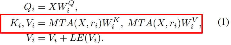 수식적으로 보면 위의 수식1처럼 나타낼 수 있는데, 이때 붉은색 박스가 바로 token을 multi-scale로 aggregation하는 것을 의미합니다. X라는 토큰에 대해 바로 Key weight와 Value weight를 곱해서 K, V token을 생성하는 것이 아닌 한번 MAT(수식에서는 MTA라고 적혀있는데 오타입니다.) 연산을 통해 다양한 scale로 변환 후 Key와 Value로 투영시키게 되는 것입니다.
