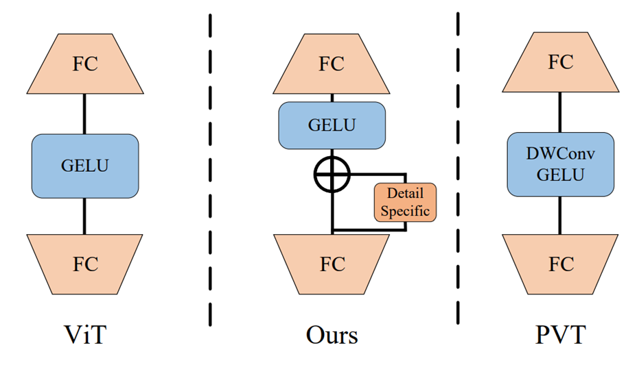 그래서 제안하는 방법도 역시나 Depth-wise convolution을 사용하고는 싶은데 그저 FC 레이어 중간에 끼어넣으면 PVT랑 크게 다른 바가 없기 때문에 이렇게 Detail-Specific이라는 모듈까지 붙여나가며 Residual 형식으로 연산을 수행하는 것을 볼 수 있습니다.