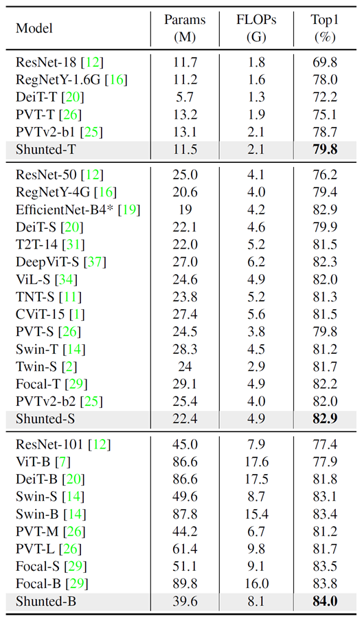 특히나 PVT를 baseline으로 잡았으니 PVT와 직접적ㅇ니 비교를 해보자면, PVT의 경우 모델의 경량화에 초점을 두었기에 성능 측면에서는 조금 부족한 부분을 볼 수 있는데, Shunted 방법론의 경우 경량화는 물론 성능이라는 2마리 토끼까지 모두 잡은 논문입니다.