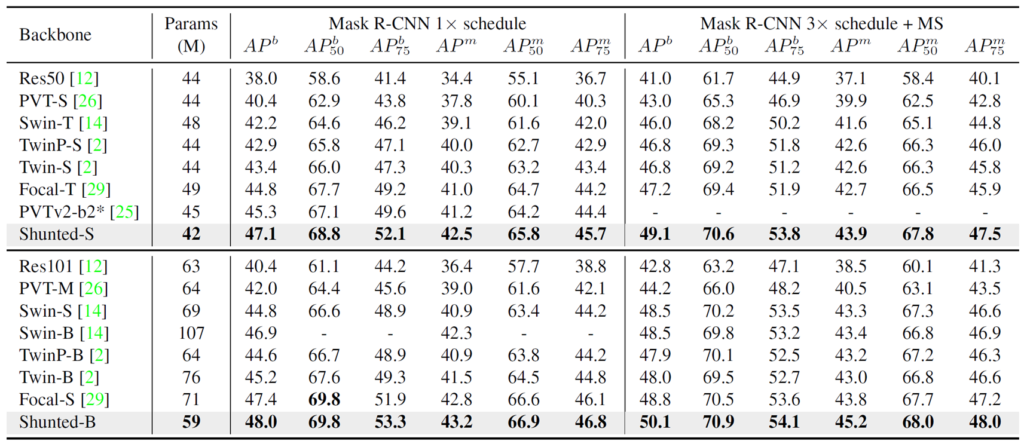 위의 표는 ImageNet-1K에 대한 정량적 결과를 의미합니다. Shunted backbone은 크게 Tiny, Small, Base로 3가지 존재하는데 놀라운점은 어떤 사이즈 백본이든 상관없이 타 방법론들의 비슷한 이름의 모델과 비교하면 모델의 파라미터 수도 매우 가벼우며 그의 비해 성능은 매우 높은 것을 확인하실 수 있습니다.
