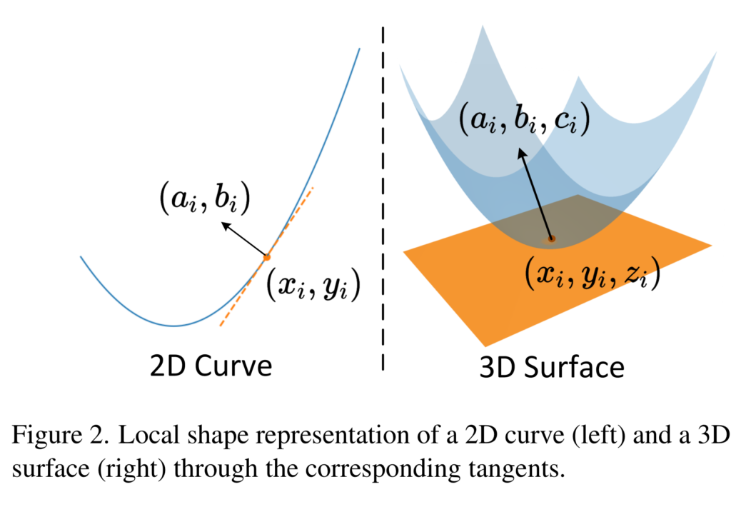 앞서 설명한 바와 같이 해당 방법론의 베이스 방법론은 테일러 급수에 해당합니다. 테일러 급수는 어떤 미지의 함수 f를 다항 함수로 근사시키는 기법에 해당합니다. 미분 계수와 일정 범위 안의 변수 값들로 통해 f를 근사시키기 때문에 정확한 함수를 찾기보단 local한 부분에 대해 빠르게 근사 시키기 위한 수학적 기법으로 많이 사용됩니다. 근데 여기서 local한 정보와 주변의 여러 포인트, 그리고 점을 미분하면 그점의 normal vector라는 점을 잘 생각해보시면, 앞서 설명한 포인트를 이용한 local shape를 표현하기에 있어 테일러 급수가 가장 정합하다는 것을 이해할 수 있습니다. Fig 2는 테일러 급수를 이용하여 2d curve(1변수; 왼쪽 그래프), 3D surface(2변수; 오른쪽 그래프)를 표현하는 것을 볼 수 있습니다.