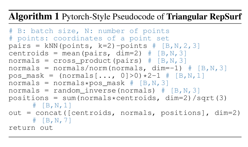 위의 알고리즘에 대해 간단하게 설명을 드리자면, 우선 메인이 되는 포인트와 이웃되는 2개의 포인트를 KNN을 통해 뽑아 상대적인 거리를 계산합니다. 그 후, 3개의 포인트(삼각형)의 중심 값을 계산한 centroids를 예측합니다. 그 다음, 3개의 포인트 간의 외적을 통해 normal vector + nomralization([1, -1]) 수행하여 normal vector를 계산합니다. 마지막으로 noraml vector와 centrodis 값 간의 곱으로 표면 함수의 스칼라에 해당하는 위치 정보 positions 정보를 획듭합니다. 최종적으로 세개의 값들을 결합하여 아웃풋 값으로 활용합니다.
