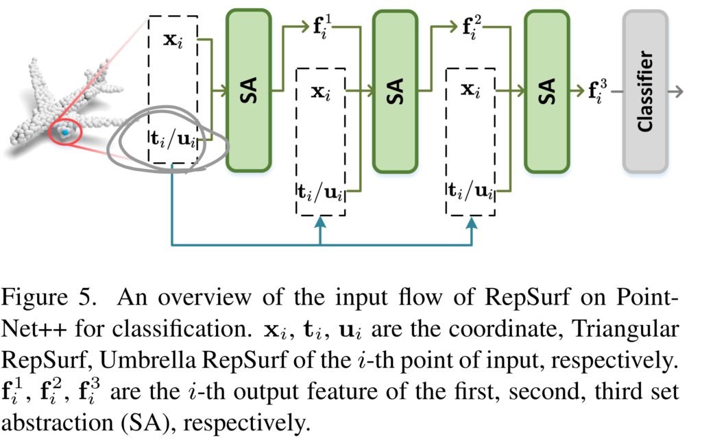 저자는 포인트 그룹 간의 표면(지역적 형태 정보)를 표현하기 위해 local shape에 해당하는 표면 함수를 예측하기 위해 테일러 급수로 부터 영감을 얻습니다. 이를 기반으로 빠른 인퍼런스를 보장하는 삼각 표면의 정보를 가진 triangular RepSurf와 K개의 이웃된 포인트로부터 보다 명식적인 표면 정보에 대해 표현 가능한 Unbrella RepSurf를 제안합니다. 저자는 두 방법론 모두 기존의 방법론의 성능과 계산량, 추론 속도 모두 뛰어넘는 결과를 보여주었으며, 3차원 물체 인식, 3차원 물체 검출, 3차원 영상 분할에서도 SOTA를 달성한 결과를 보여줍니다.