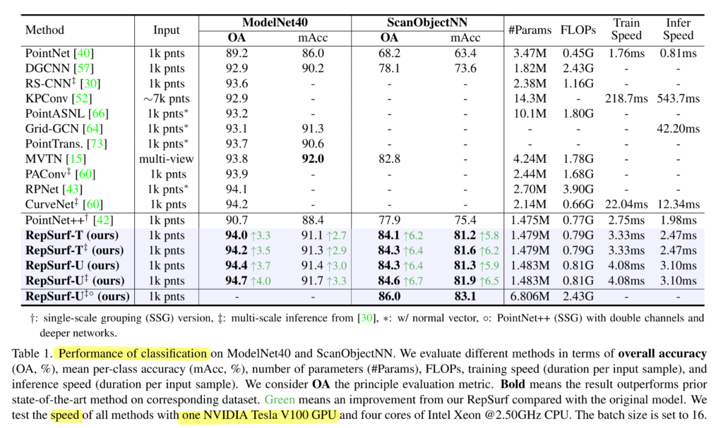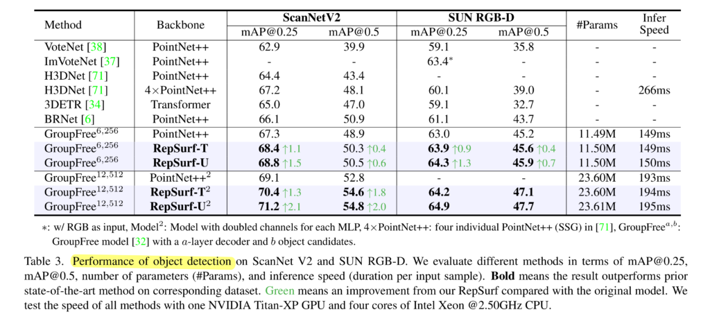 다양한 3차원 비전 태스크 Table {1~3}에서 볼 수 있다시피 RepSurf만을 추가한 것만으로도 베이스 방법론 성능을 뛰어넘은 것을 볼 수 있습니다. 이를 통해 해당 방법론이 3차원 표현에 있어 보편적인 성능을 가졌음을 증명합니다.