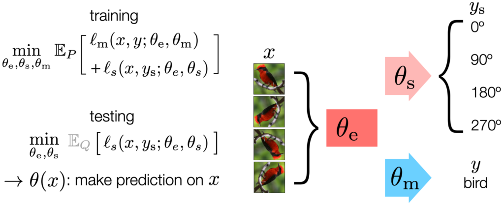 이 방법을 제안한 motivation은 self-supervised learning에서 시작되었습니다. 테스트에서는 레이블이 없으니, 이 테스트 동안에서 모델을 업데이트하는 것은 어려운 일이었습니다. 그러나 이 문제를 self-supervised learning으로 전환하여 테스트 샘플 x에서 pretext task라는 보조적인 학습법을 추가하여 모델을 학습합니다. 여기서는 이미지를 회전시키는 augmentation을 통해 모델의 회전 각도를 맞추는 것을 pretext task로 설정하였습니다.