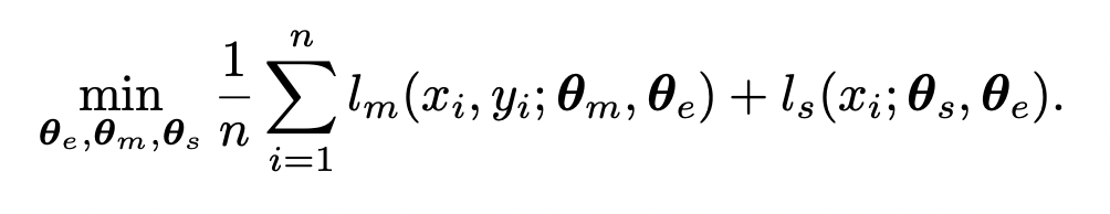 따라서 본 논문에서는 이 auxiliary task를 함께 사용하여 일부 파라미터를 공유하는 Y구조의 모델을 제안하게 됩니다. 아래 \theta_e가 Y-structure 중 main과 self task가 공유하는 파라미터이고, \theta_s는 self-supervised task 그리고 \theta_m은 main task 학습 시 업데이트 되는 파라미터가 됩니다.