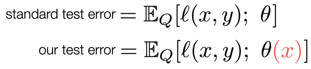 참고) 기존 standard test error를 변형하여 본 논문에서 제안하는 test 에러는 다음과 같습니다. Test-Time Training에서는 expected loss 를 수정하여 레이블은 보지 않고 파라미터 θ가 테스트 입력 x에 의존하게 됩니다.