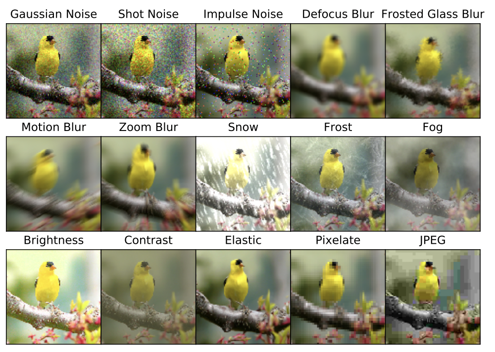 본 논문에서는 Corrupted 이미지를 사용합니다. d아래 ImageNet에 대하여 여러 버전의 corrupted를 시도한 결과를 나타냅니다. 이 왜곡을 각각의 데이터에 수행한 결과를 ImageNet-C 그리고 CIFAR-10-C라고 말합니다.