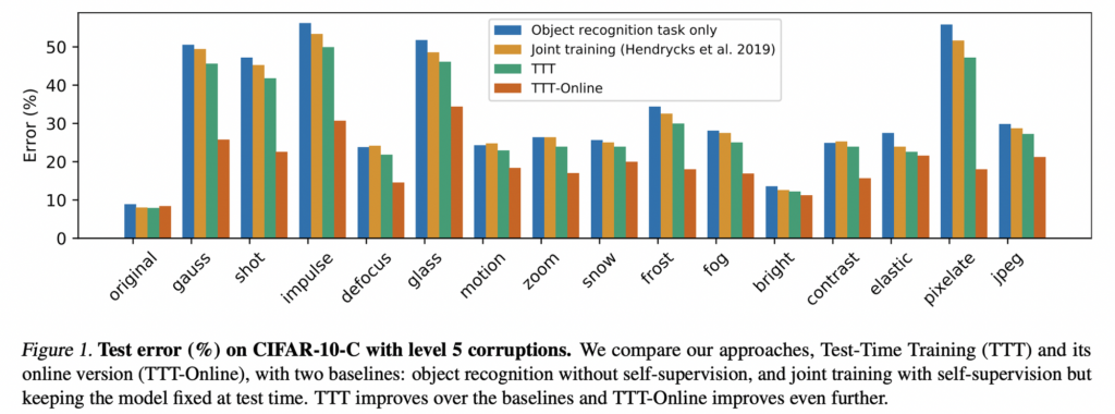 왜 이런 방식을 제안했을까요? 바로 domain adaptation 연구가 등장한 배경과 비슷하다고 생각하시면 좋을 것 같습니다. 지도 학습 기반의 방법론은 아무래도 테스트 데이터와 다른 분포를 보인다면 성능 차이가 많이 나기도 합니다. 따라서 학습과 평가 데이터 사이의 도메인 갭을 줄이기 위해서 domain adaptation 연구가 등장하였습니다. 그러나 본 논문에서는 test 하는 동안 모델을 업데이트 시켜 일반화를 할 수 있는 새로운 관점인 test 동안에서의 업데이트 방식을 제안합니다.