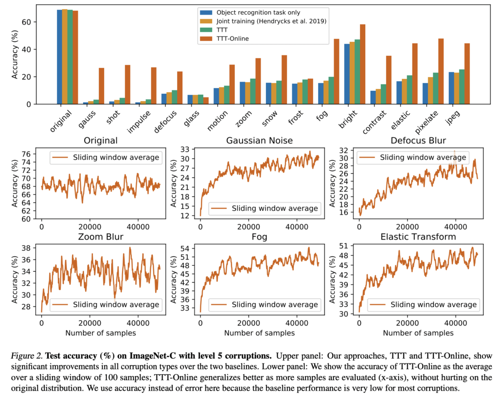 가장 먼저 classification에 대한 실험입니다. train으로는 원본 데이터를, 그리고 test 로는 ImageNet-C 혹은 CIFAR-10-C를 사용합니다. Online Test-Time Training에서는 전체 테스트 세트를 이미지의 스트림으로 받아들이고, 도착하는 대로 각 이미지를 온라인 방식으로 업데이트하고 테스트하는 방식입니다, 아래 Figure.1이 가장 심각한 corrupted 인 레벨 5에 대한 실험 결과인데요, 모든 corruped 에 대해서 성능이 많이 향상된 것을 볼 수 있었습니다.