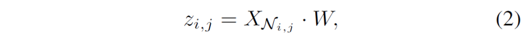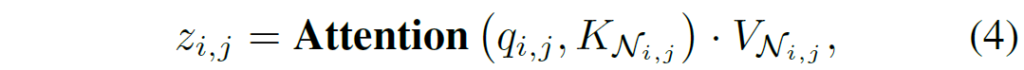 여기서 q_{i,j} = X_{i, j}W_{Q} 입니다. 여기서 K와 V는 K_{i, j}가 아닌 K_{N_{i, j}} 인 것을 보면 아시다시피 위 설명처럼 주변 9개의 셀에 대한 K와 V라고 보시면 됩니다.