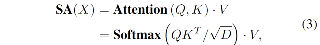 여기서 X는 input feature( R^{H \times W \times D}), W는 kernel(R^{k \times k \times D \times D}를 의미합니다. 그리고 Self-attention은 아래 수식처럼 나타낼 수 있습니다.