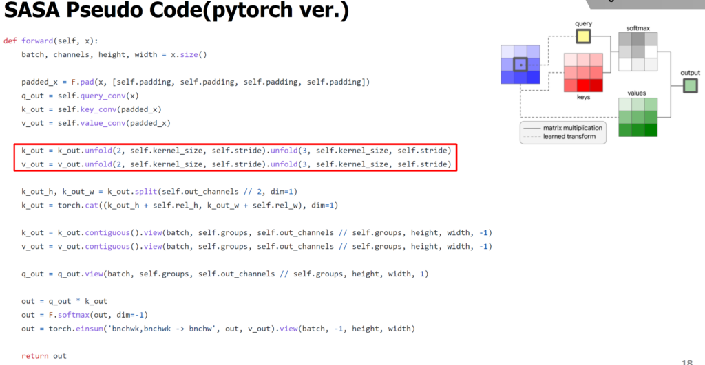 요약하자면 unfold는 행렬과 유사한 방식으로 연산하는 과정을 벡터 연산으로 수행하기 위해 표현을 바꾸는 함수라고 보시면 될 것 같으며 이러한 unfold 과정이 위에 말한 SASA 방법론 구현에 들어가게 됩니다.