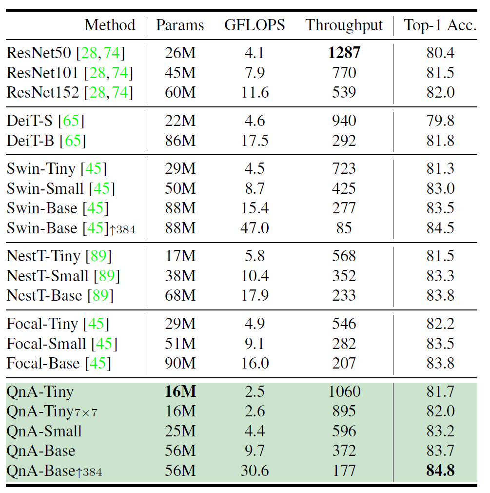 Swin과 Nest는 쉽게 말해 흔히들 사용하는 3×3 또는 2×2 컨볼루션과 stride로 down-sampling하는 과정을 의미합니다. 놀라운 점은 논문에서 제안한 QnA 기법으로 down-sampling을 하였을 때 모델의 파라미터는 Swin down-sampling과 동일하면서 정확도가 무려 0.7% 상승했다는 점입니다.