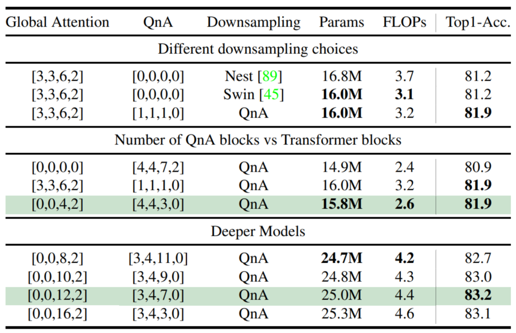 다음은 Ablation study에 대한 결과인데 위에서부터 차례로 downsampling layer를 무엇을 사용할지와 QnA block과 Transformer block의 적절한 조합 그리고 더 깊은 레이어에서의 조합 결과를 보인 것으로 이해하시면 됩니다.