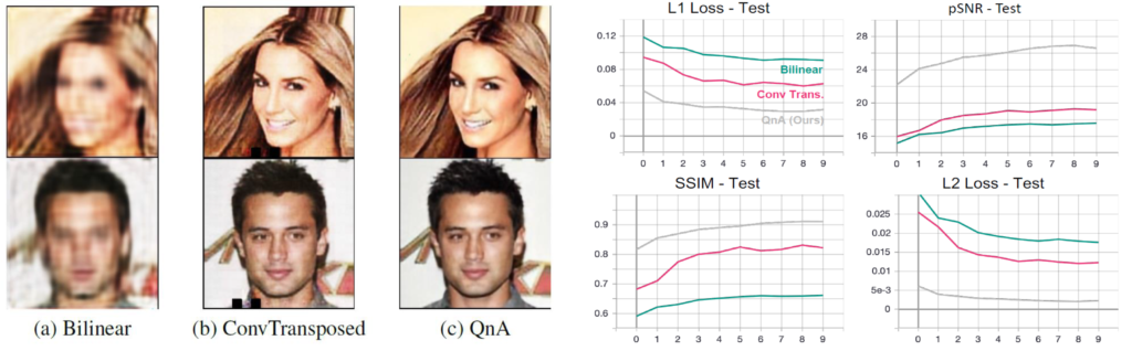 다음으로는 제가 가장 흥미롭게 봤던 실험 부분으로 위에서 설명한 down-sampling 뿐만 아니라 upsampling을 수행할 때의 QnA 유효성을 검증한 부분입니다. 저자는 QnA upsampling의 성능을 보기 위해 5개의 layer로 구성된 encoder-decoder 구조 네트워크로 영상 합성 task를 진행하였습니다.