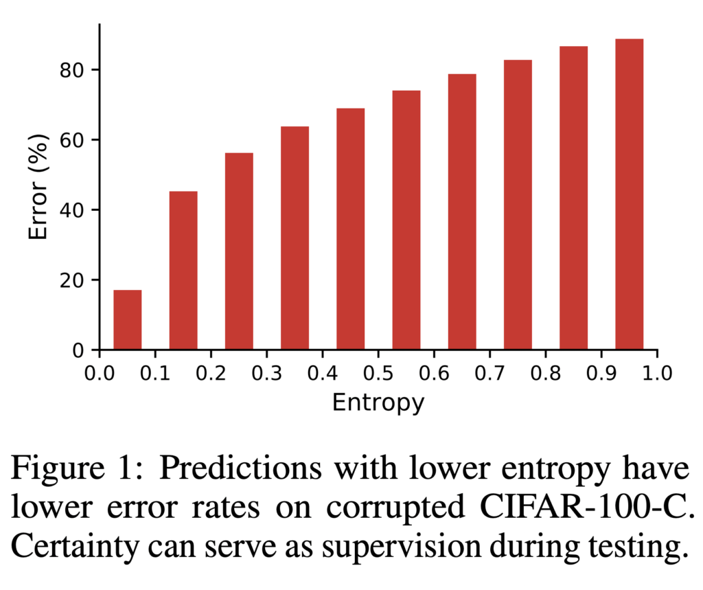보시면 낮은 엔트로피를 가지는 예측값은 에러 역시 작습니다. 즉, 엔트로피는 에러값과 관련이 있다는 것이죠. 사실 말이 어렵지 단순하게 엔트로피가 낮아야 신뢰도가 높은 예측이다 정도로 이해하시면 될 것 같습니다. 엔트로피랑 에러가 그만큼 관련이 있으니 엔트로피 만으로도 모델을 업데이트 할 수 있다는 것이 저자의 생각이죠.