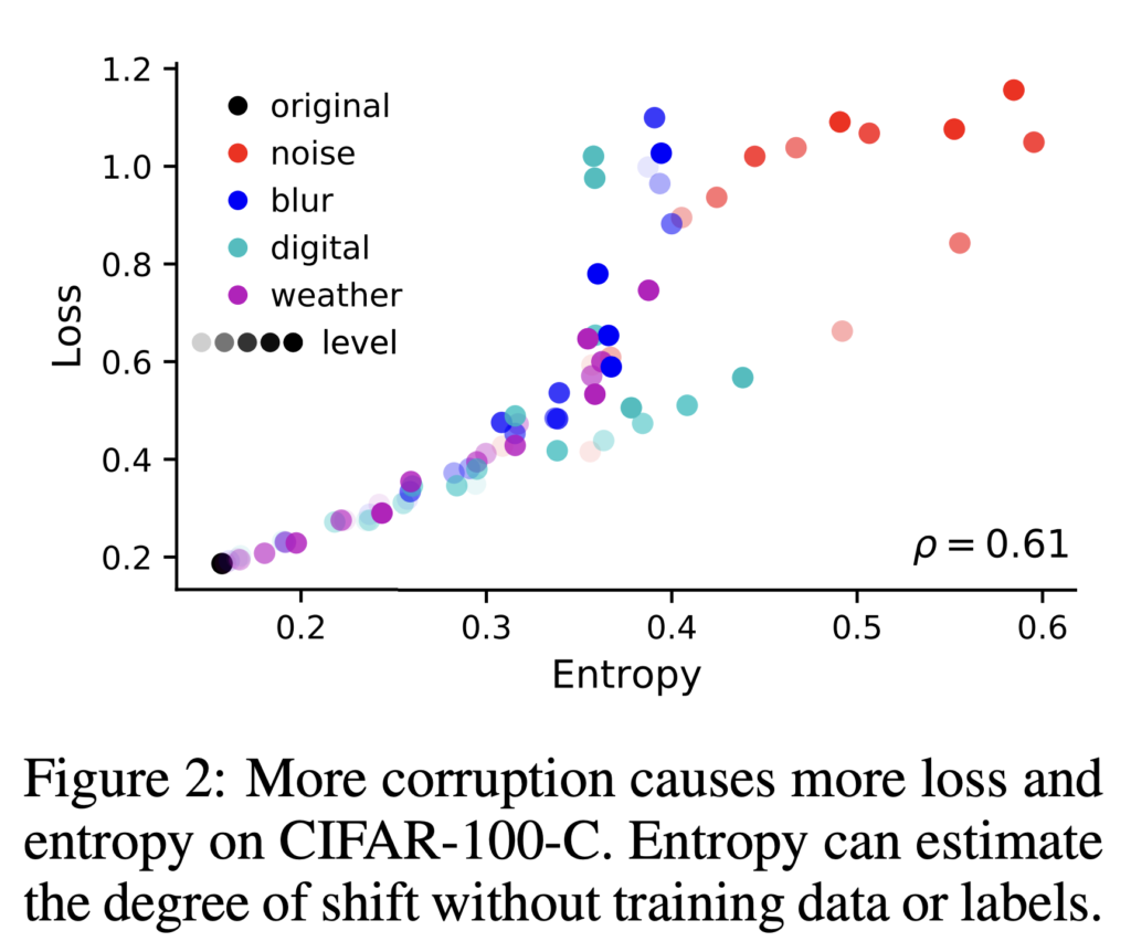 저자 역시 마찬가지로 상단 그림을 통해 엔트로피는 corruption이 많을 수록 커지며, 이는 shift과 관련이 있다는 것으로 판단할 수 있다고 주장하였습니다. (corruption level이 높을수록 entropy, loss 둘 다 linear 한 경향으로 커지는 것을 상단 그림을 통해 확인하실 수 있을 것입니다. 이를 통해 entropy로 corruption/shift 정도를 추정하는 것이 가능하다고 판단하게 된 것이죠) 따라서 corruption level이 증가할수록 이미지 classification의 loss와 상관관계가 있으며 이를 사용한 모델 업데이트가 reasonable 하다는 것이 그 주장이 되겠습니다.
