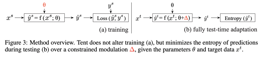 아래 테이블이 바로 저자가 주장하는 TENT의 차별점인데요, 보시면 Target data (타겟의 라벨 y^t이 아닌 x^t) 만 사용하여 모델을 업데이트할 수 있다는 강점이 있습니다. 즉, adaptation을 하는 동안에는 source data는 일절 사용하지도 의존하지도 않고 오직 Target 데이터만을 사용하게 됩니다. 그게 어떻게 가능할까요?
