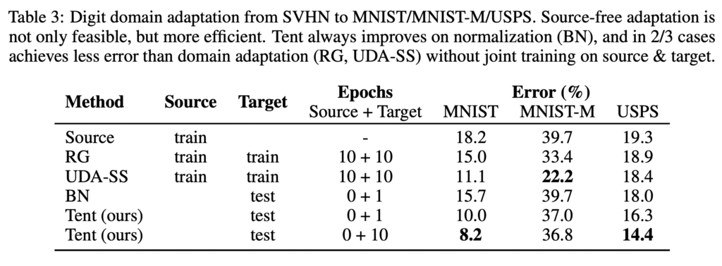 해당 논문의 성능 및 비교한 테이블입니다. 해당 분야가 등장한지 얼마 되지도 않은데다 정확도로는 너무 높지 않아서 보통 에러로 많이 표기한다고 합니다. TENT 의 경우, MNIST에서도 그리고 USPS에서도 상당히 좋은 성능을 내는 것을 확인하실 수 있습니다.