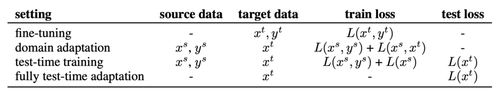 제목에서 유추할 수 있듯, Adaptation 관련한 논문인데요. Domain Adaptation과는 약간 다릅니다. 왜냐하면, DA의 경우 Target Dataset과 Source를 동시에 사용하여 학습하는 반면, 본 연구에서 주장하는 Test-Time Adaptation은 Target 데이터의 distribution을 몰라도 타깃 도메인으로 adaptation이 가능합니다.