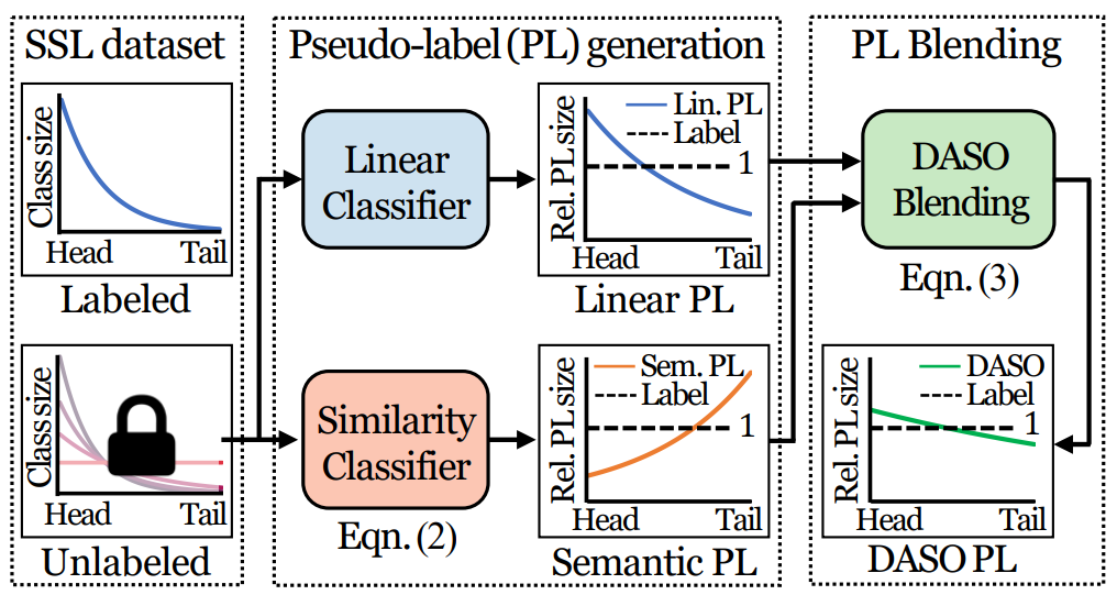 잘 가공된 labeled data와 unlabeled data는 분포차이(class distribution mismatch)나 편향(class imbalance)가 존재할 수 있다. 본 논문은 이러한 real-world application에서 발생할 수 있는 문제에 대응할 수 있는 프레임워크 Distribution Aware Semantics-Oriented(DASO)를 새롭게 제안하였다. 간단하게 이해한대로 소개하자면 해당 논문은 이러한 문제를 prototype pseudo label과 linear pseudo label을 distribution-aware blending 과정으로 통합한 새로운 pseudo label과 이를 해결할 수 있는 새로운 loss인 Semantic alignment loss를 제안하고 이를 통해 문제를 해결하였다. 또한 해당 제안점들은 기존의 다른 SSL(semi-supervised Learing)에 plug-in 할 수 있어 유용성을 더했다. 자세한 논문 소개는 아래와 같다.