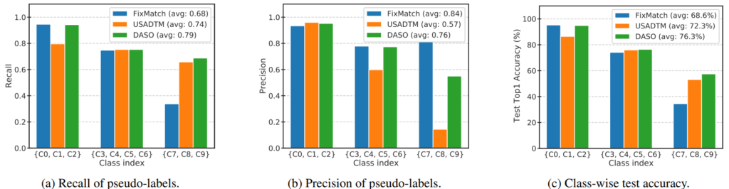 여태까지 semi-supervised learning에서 사용했던 pseudo label의 타입은 2개로 나뉠 수 있다. 논문의 표현을 그대로 사용하자면 linear pseudo label과 semantic pseudo label이다. fixmatch 에서는 각각 soft label과 hard label로 불렀던것 같은데, linear pseudo label은 모델의 예측을 그대로 사용하는 것이고 semantic pseudo label은 prototype과 같이 미리 정의한 class를 pseudo label로 사용하는 것이다. 즉 우리에게 친숙한 개, 고양이 문제에서 분류 모델 A로 생성한linear pseudo label은 (0.7, 0.3)이고 semantic pseudo label은 ‘개’ 인 것이다. 해당 논문에서는 semantic label type의 semi-supervised learning 대표주자로 USADTM[1]을, linear label의 대표주자로는 FixMatch[2]를 선정하여 두 방법론을 비교하였다. FixMatch와 USADTM는 모두 2020년 NIPS에 소개된 방법론이다. 각 논문에 대한 reference 또한 아래 남기겠다. 실험의 결과는 위 [그림1]과 같은데, 두 방법론 모두 class imbalanced 상황에서 소수 클래스에서 성능 하락을 보이긴 했으나 accuracy의 결과를 기준으로 semantic label type이 조금 더 강인했음을 알 수 있다. 그러나 semantic 방법론은 성능 상승의 한계가 있는 걸 알 수 있다. 예를 들어 recall 성능 비교에서 linear type과 제안하는 방법론은 다수 클래스에서는 높은 성능을 보인다. 그러나 semantic type은 그렇지 못하다. 이러한 분석을 기반으로 linear type과 sematic type을 적절히 blending해 상황에 최적인 pseudo label을 만드는 것이 해당 방법론의 하나의 제안점이다.