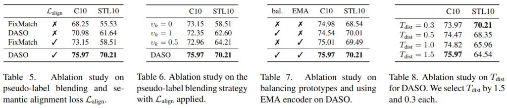 본 논문은 제안하는 방법론의 효과를 ablation study로 증명하였다. 먼저 Table5는 semantic alignment loss의 유용성을 table 6은 제안하는 pseudo label blending 기법에 대한 실험이다. 또한 실험 setting (hyper parameter, pseudo label 생성 encoder의 EMA 사용 여부 등)에 대한 비교실험 또한 table 7, 8을 통해 공개하였다.